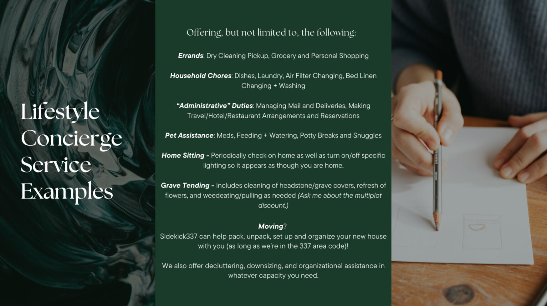Though known for our cleaning services, that is not where Sidekick337's limitations lie. We pride ourselves in being a concierge service dedicated to assisting you with a myriad of needs you may have.