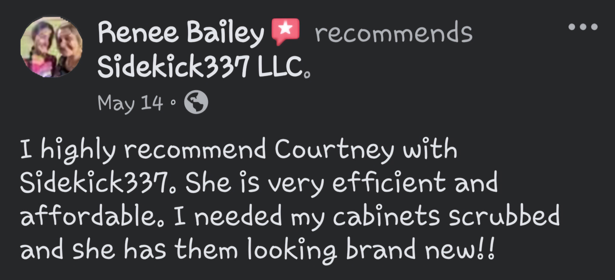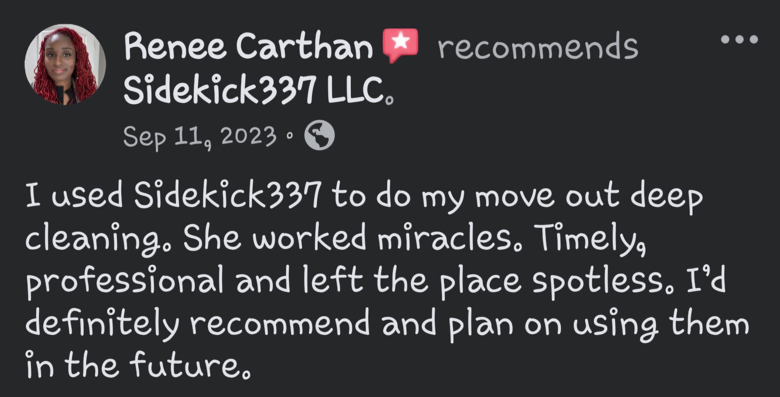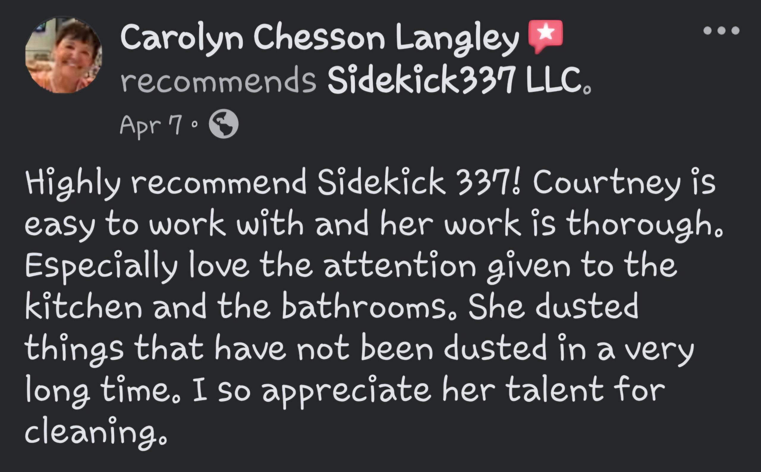 *High dusting: ceilings, ceiling fans, corners of the rooms, tops of large furniture, blinds/curtains, etc.
